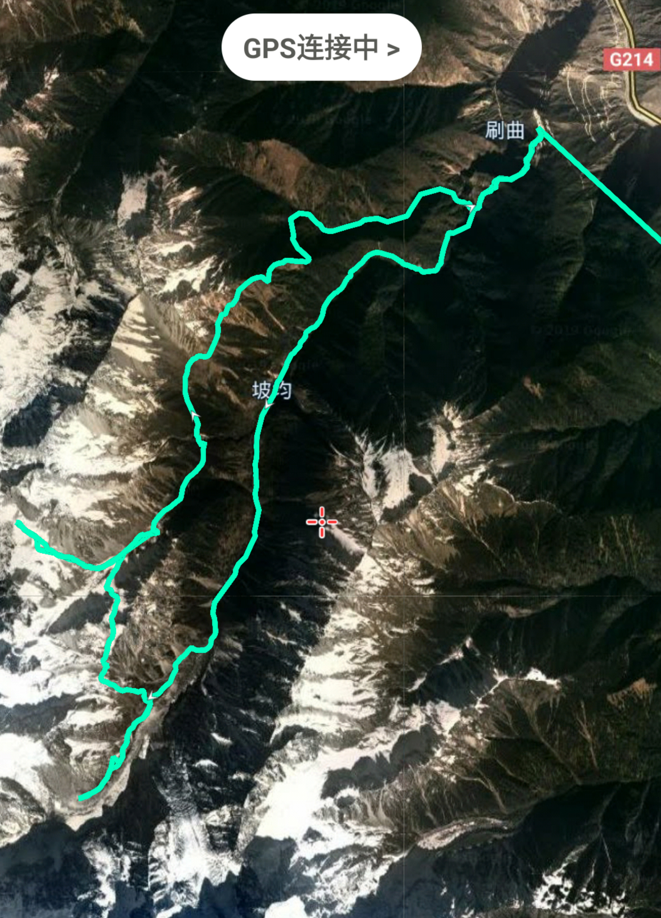 翻过垭口的坡背面,有着相当的积雪,下山曲折的小路有点湿滑,此段建议全程至少佩戴一根登山杖。数据表明,合理使用登山杖能在各种环境下有效减轻12%~25%的膝盖冲击力。